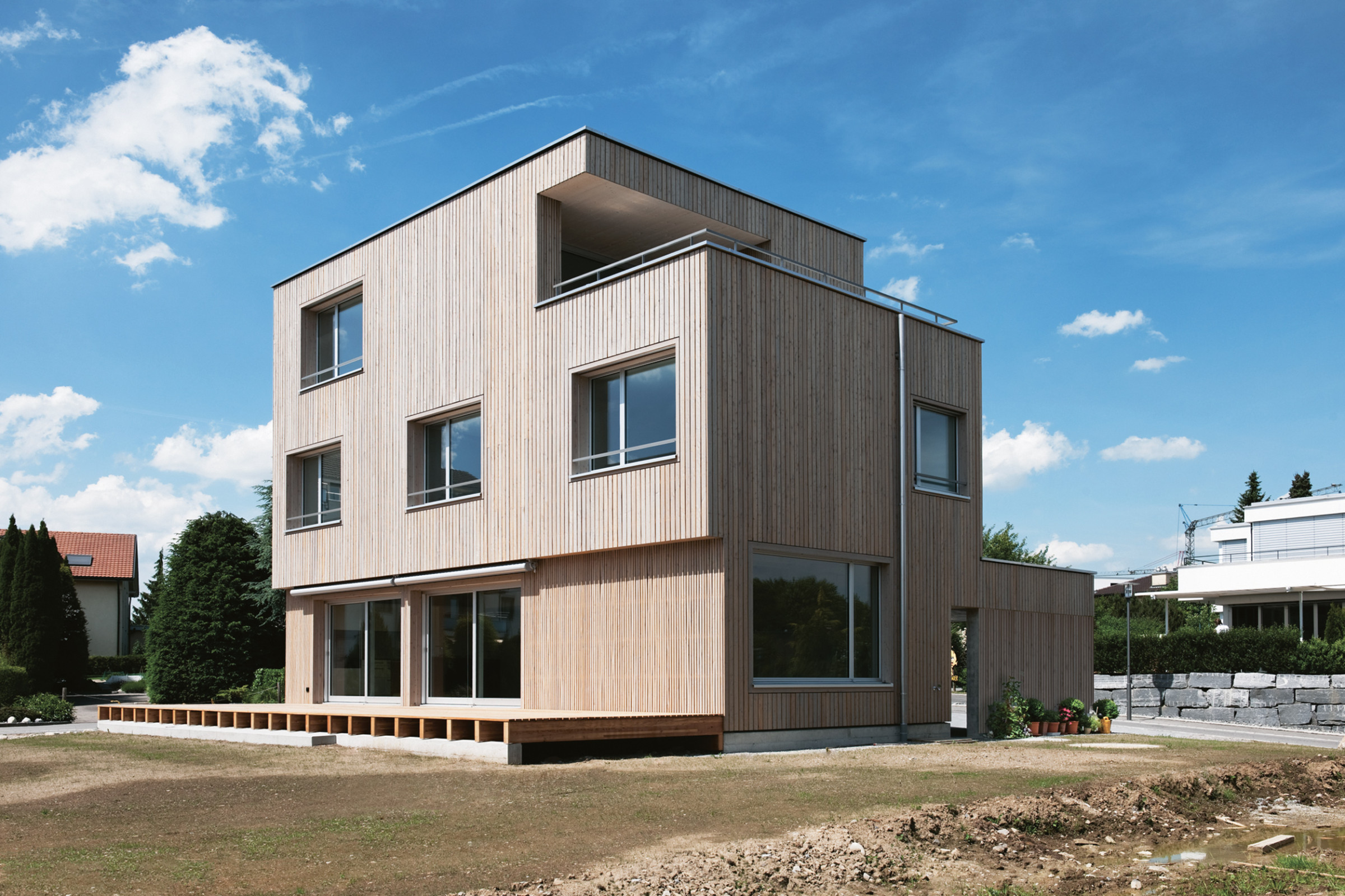 Die Wärmeerzeugung erfolgt mit einer Luft-Wasser-Wärmepumpe und die Gebäudehülle erfüllt den Minergie-Standard. Mit seinen grossformatigen Holz-Metallfenstern mit hölzernen Einfassungen und einem Kleid aus vorvergrauter Lärche hebt sich der Neubau deutlich von den ihn umgebenden weissen Kuben ab.