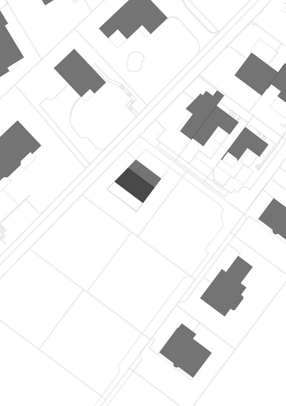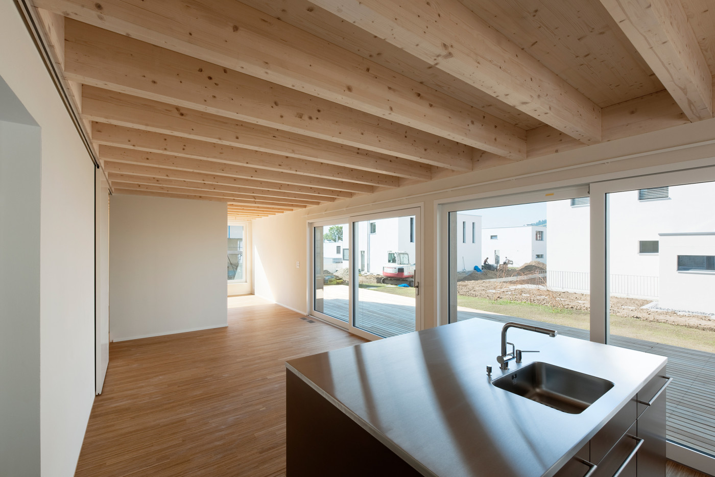 Der Neubau besetzt die nordöstliche Ecke des Grundstücks. Das Erdgeschoss ist dabei nach Südwesten orientiert. Durch das Ineinanderschieben von Parkierung und Eingangsbereich entsteht die maximale Distanz zu den Nachbarn. Die grosszügige Veranda mit ausgefahrener Markise verdoppelt bei Schönwetter den Wohnraum. Die sichtbare Holzbalkendecke und die leicht getönten Wände sorgen für ein äusserst wohnliches Ambiente.