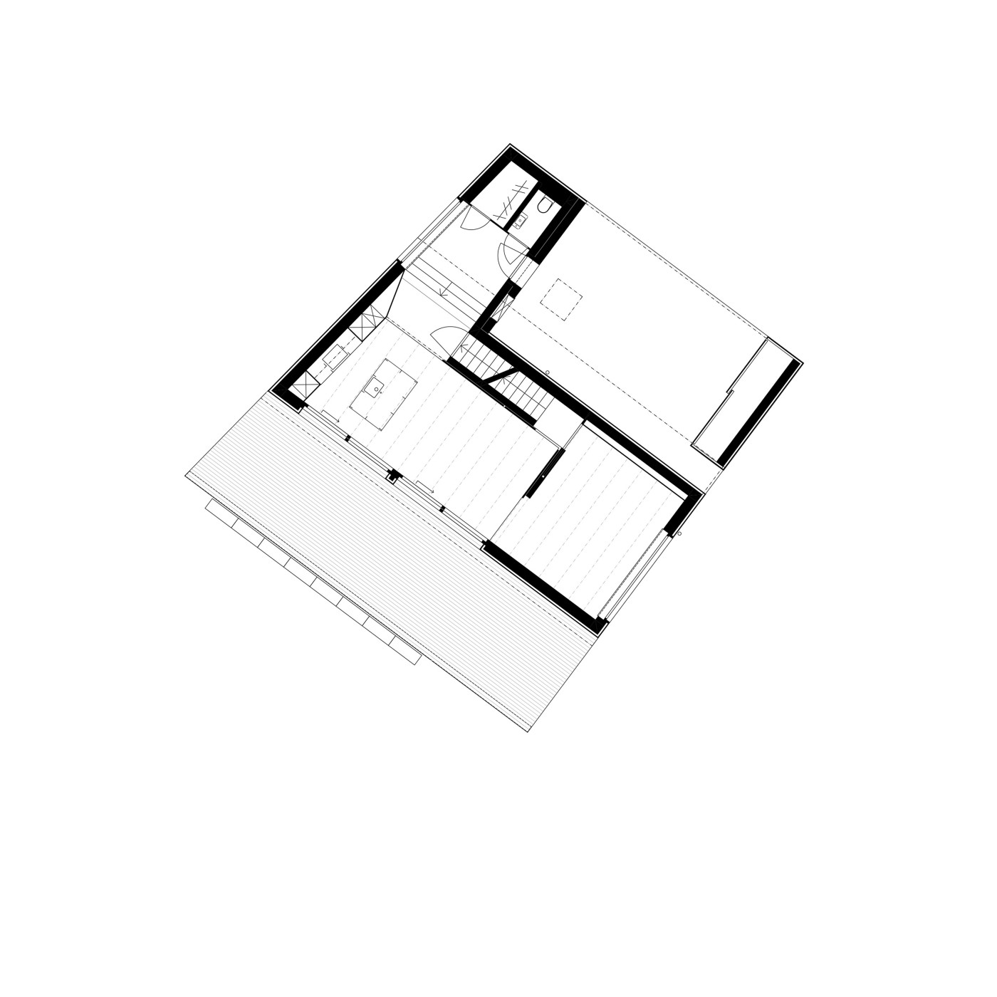 Im Obergeschoss sind drei beinahe quadratische Zimmer entlang der linearen Erschliessung aufgereiht. An deren Ende befinden sich das Bad und ein Arbeitsbereich. Im Dachgeschoss lässt sich das Elternschlafzimmer, oder ein zweites Wohnzimmer, mit einer Schiebetüre vom restlichen Geschehen abtrennen. Nach dem Aufstieg winkt die Aussicht als Belohnung.