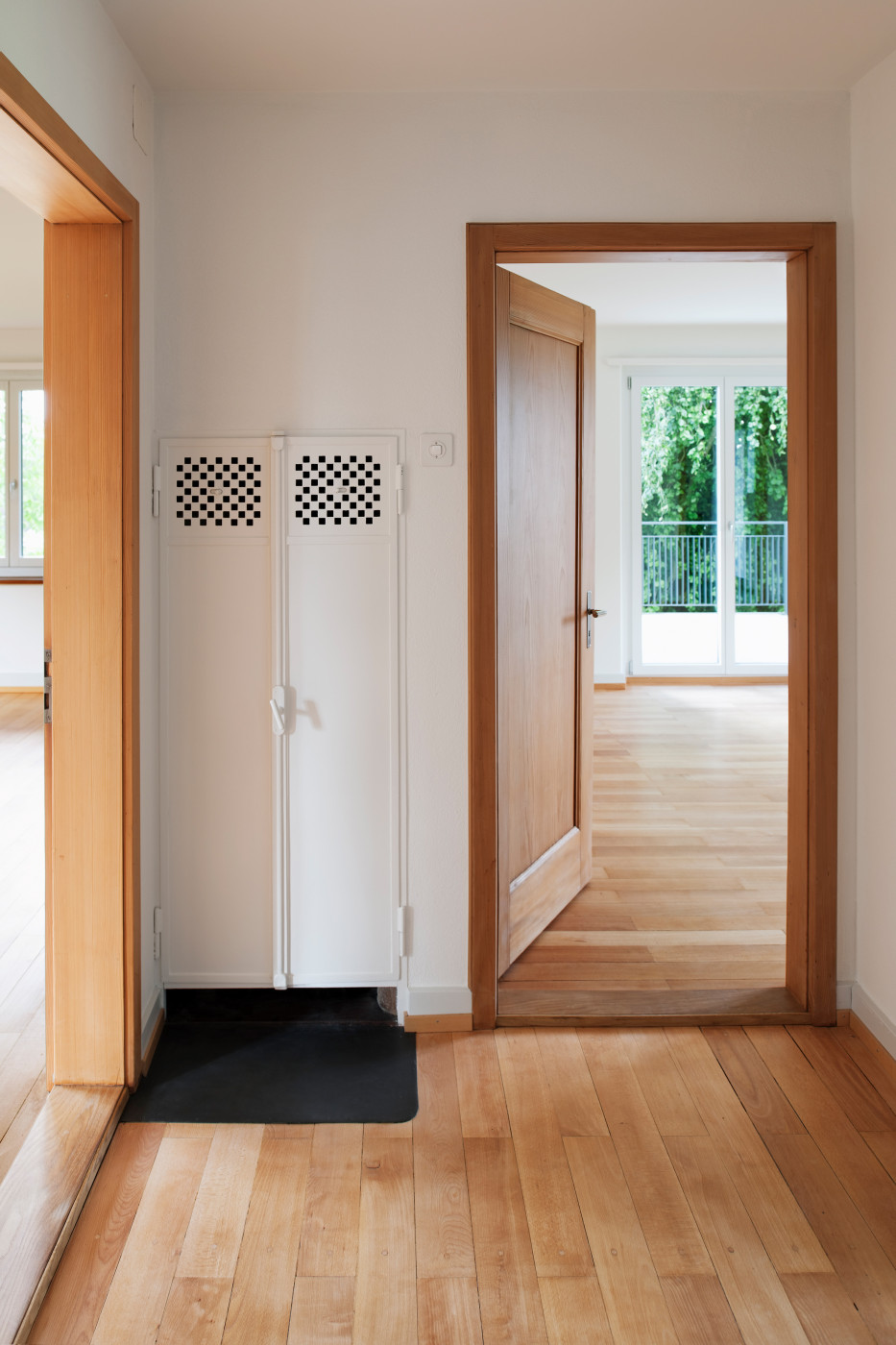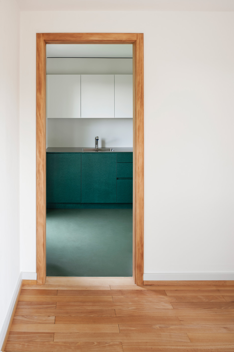 Buchenparkett und Massivholztüren in Tanne werden aufgefrischt; Tapeten wo nötig ergänzt oder ersetzt; Decken, Wände und Einbauten frisch gestrichen. Die formal stark reduzierte Küche mit grünen Unterbauten und grünem Linoleum-Boden schafft einen neckischen Kontrast zur 70 jährigen Umgebung.