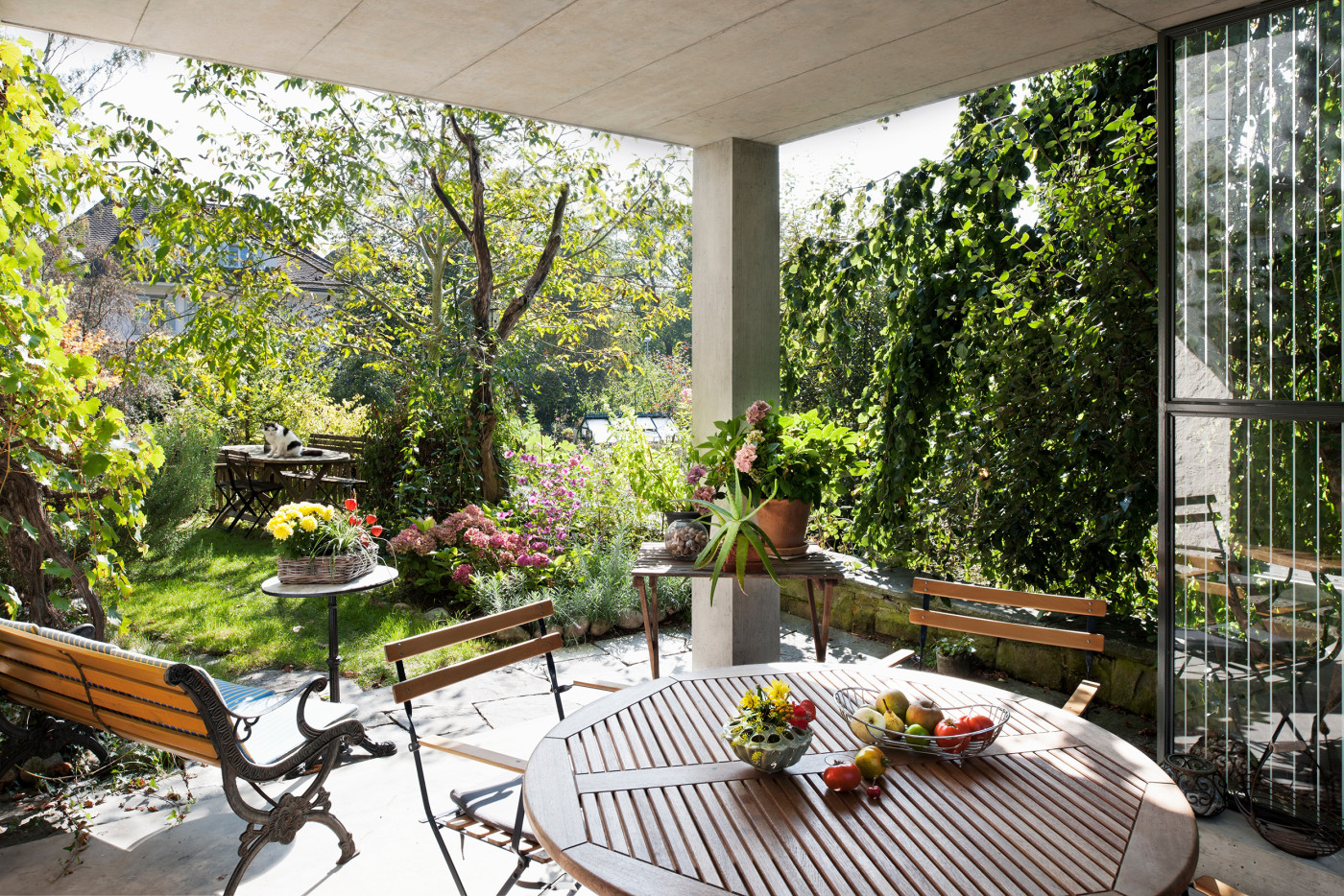 Für die neue Terrasse muss die alte, düstere Gartenhalle weichen. Sie wird durch eine einfache Betonstruktur, eine Platte auf vier eingespannten Stützen, ersetzt. Bedrucktes Glas dient als Windschutz und bringt viel Licht auf den Gartensitzplatz und in die angrenzenden Räume.