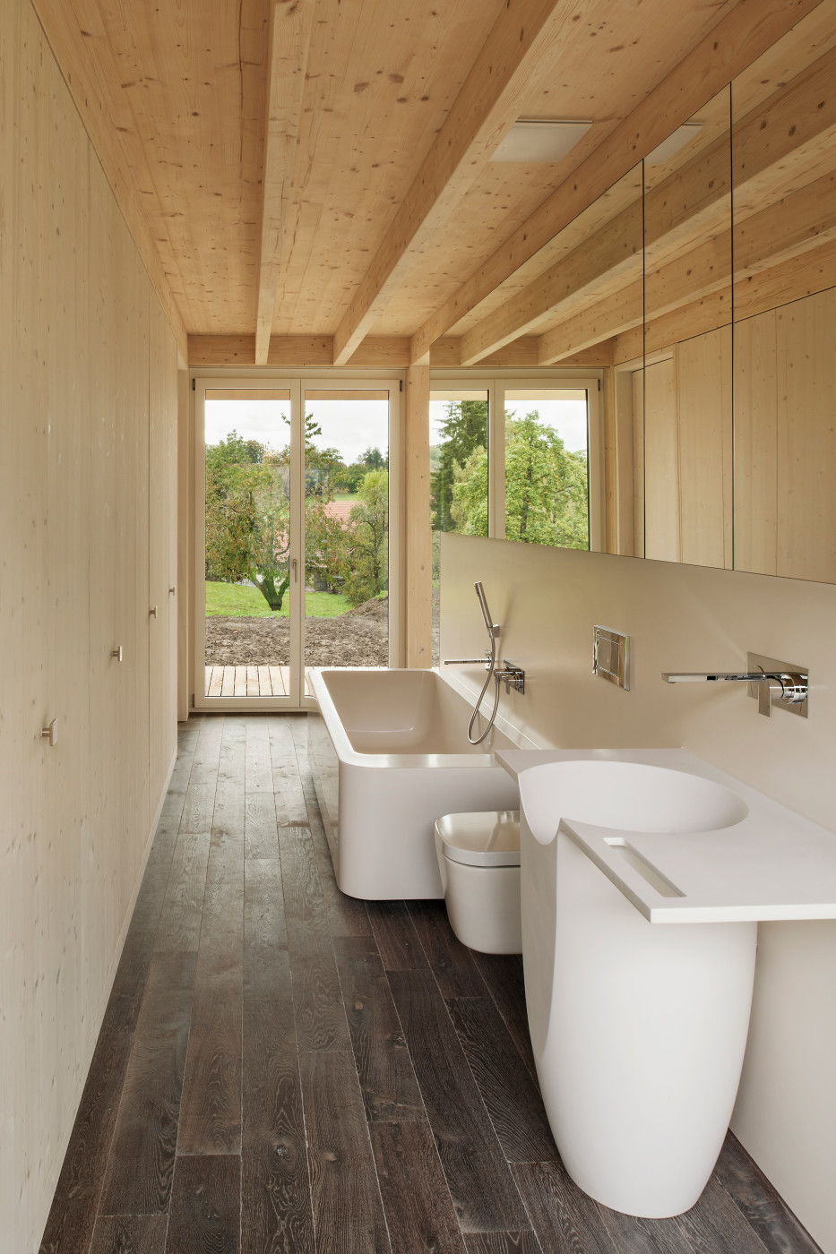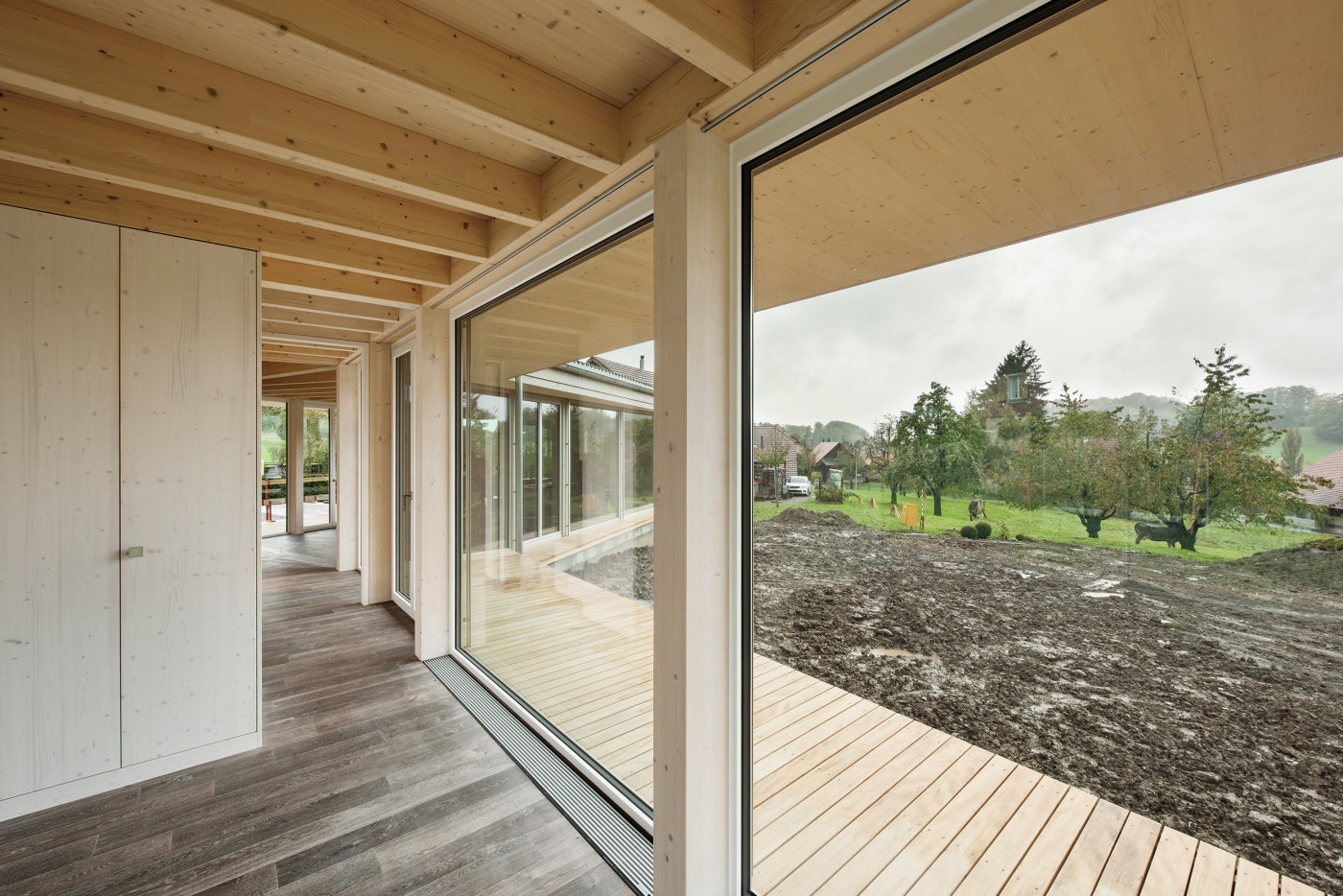 Die einzelnen Räume sind entlang der Fassade erschlossen. Der Grundriss ist so angelegt, dass eine Transformation in ein 7-Zimmerhaus möglich ist. Die Nebenräume sind als farblich leicht abgesetzte Einbauten zwischen Holzbalkendecke und Boden eingepasst. Die Küche ist ein Ensemble fixer und mobiler Korpusse, die je nach Bedarf kombinierbar sind.