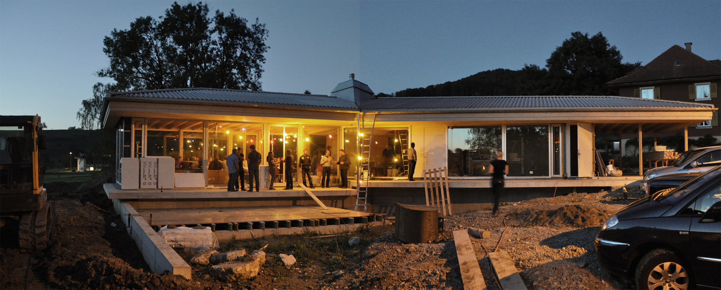 Der eingeschossige Holzbau steht auf einer Plattform aus Beton. Die Lasten werden über die Fassadenstützen abgetragen. Die Aussteifung wird mittels filigranen Zugstangen aus Stahl erreicht. Das Dach in Welleternit ist den landwirtschaftlichen Bauten der Umgebung nachempfunden.