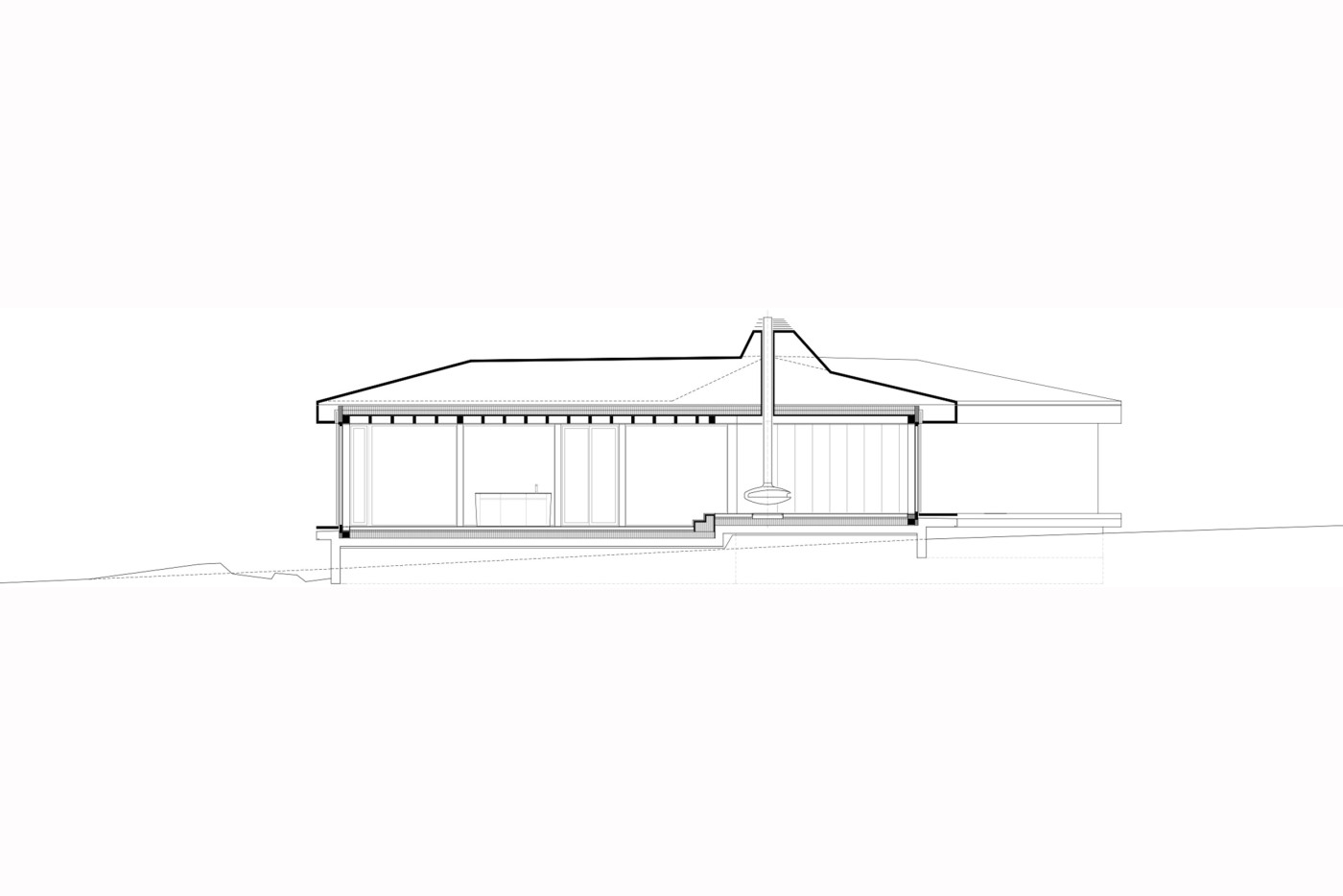 Der sternförmige, rundum verglaste Bau liegt am Rand der Wohnzone im ländlichen Kulmerau. Er breitet seine Arme aus und lässt Innen- und Aussenraum zu einem Kontinuum verschmelzen. Im Schnittpunkt der Gebäudeflügel liegt der offene Kamin, er bildet das Zentrum des Hauses.