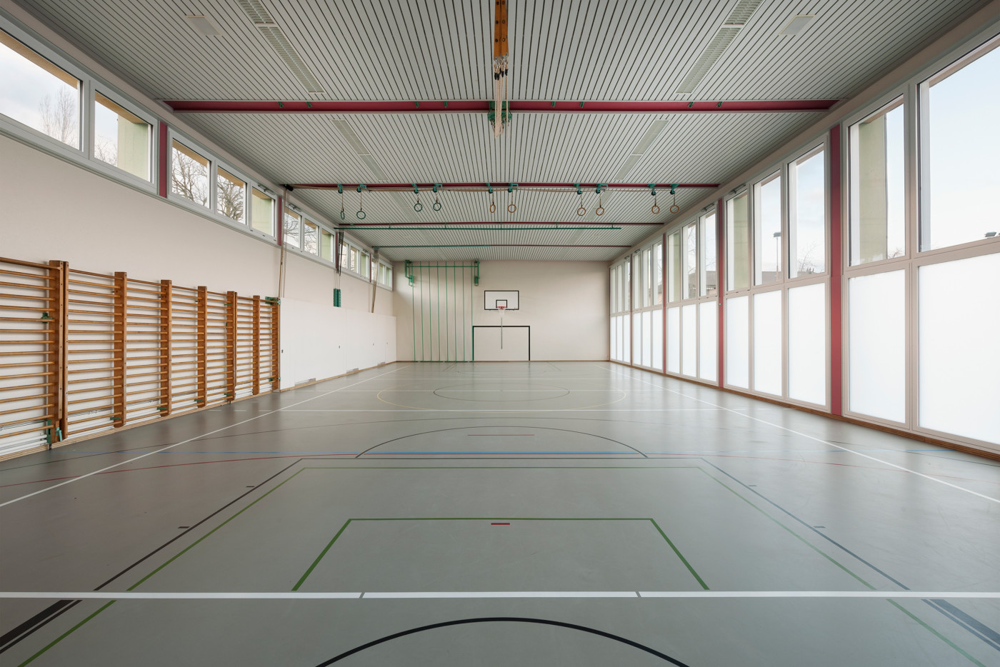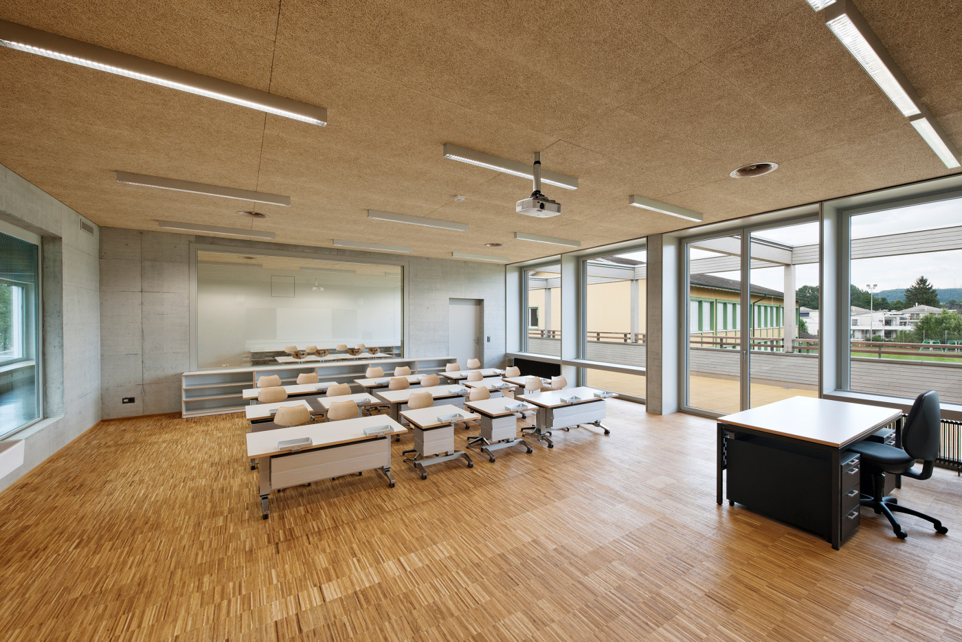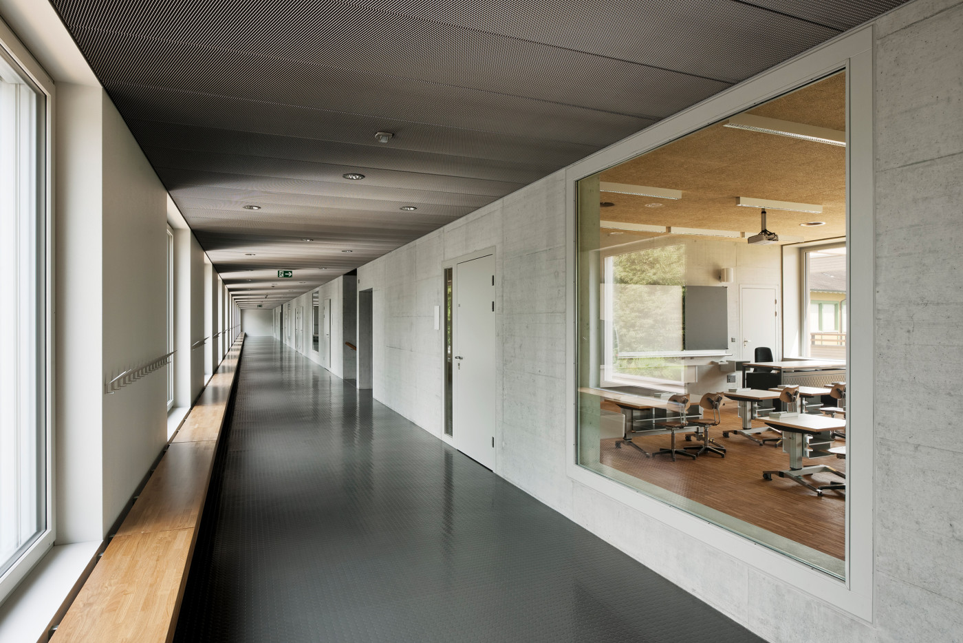 Sowohl im Neubau wie auch in den Bestandsbauten schaffen Verbindungstüren und Sichtbezüge unter den einzelnen Räumen die nötige Transparenz und Flexibilität für einen zeitgemässen Schulunterricht. Rohe Materialien und eine neutrale Farbgebung vermitteln dabei das angestrebte Bild einer Lern-Werkstatt und lassen ein Maximum an individuellem Gestaltungsraum zu.