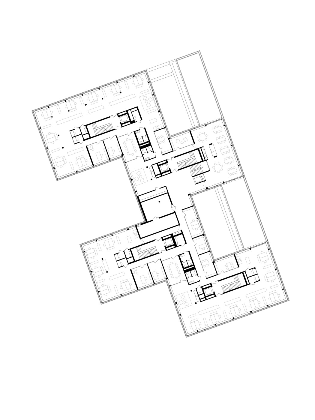 Jedes der oberen Geschosse zählt zwölf Wohnungen. Die kleineren, zentral liegenden Wohnungen sind in der Diagonale von Ost nach West organisiert und grenzen jeweils an zwei Höfe. An den Enden der einzelnen Gebäudearme liegen die grossen, auf drei Seiten orientierten Wohnungen. Bandfenster, offene Raumabfolgen und raumhohe Türen verleihen den Wohnungen Loft-ähnlichen Charakter. Sämtliche Loggien sind nach Süden oder Westen orientiert.