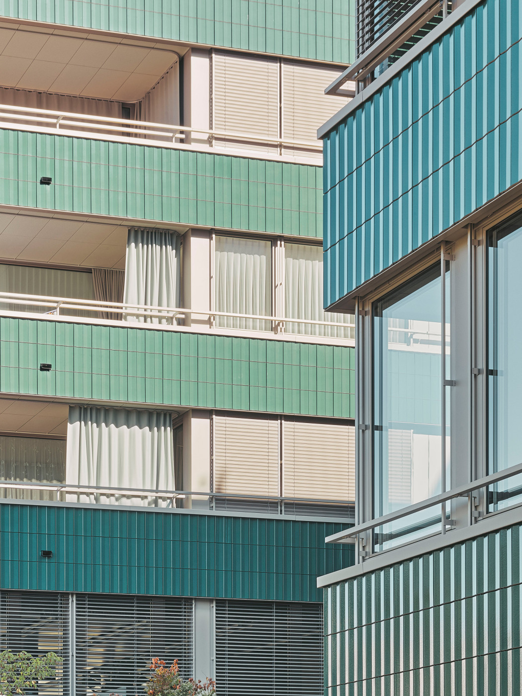 Glanz, Relief und Farbe der massgeschneiderten Keramikfassade tragen dazu bei, dass sich mit den im Verlauf des Tages ändernden Lichtverhältnissen auch das Aussehen des Gebäudes wandelt. Aussenvorhänge auf den Loggien und Ausstellmarkisen im Erdgeschoss tun das Ihrige dazu.