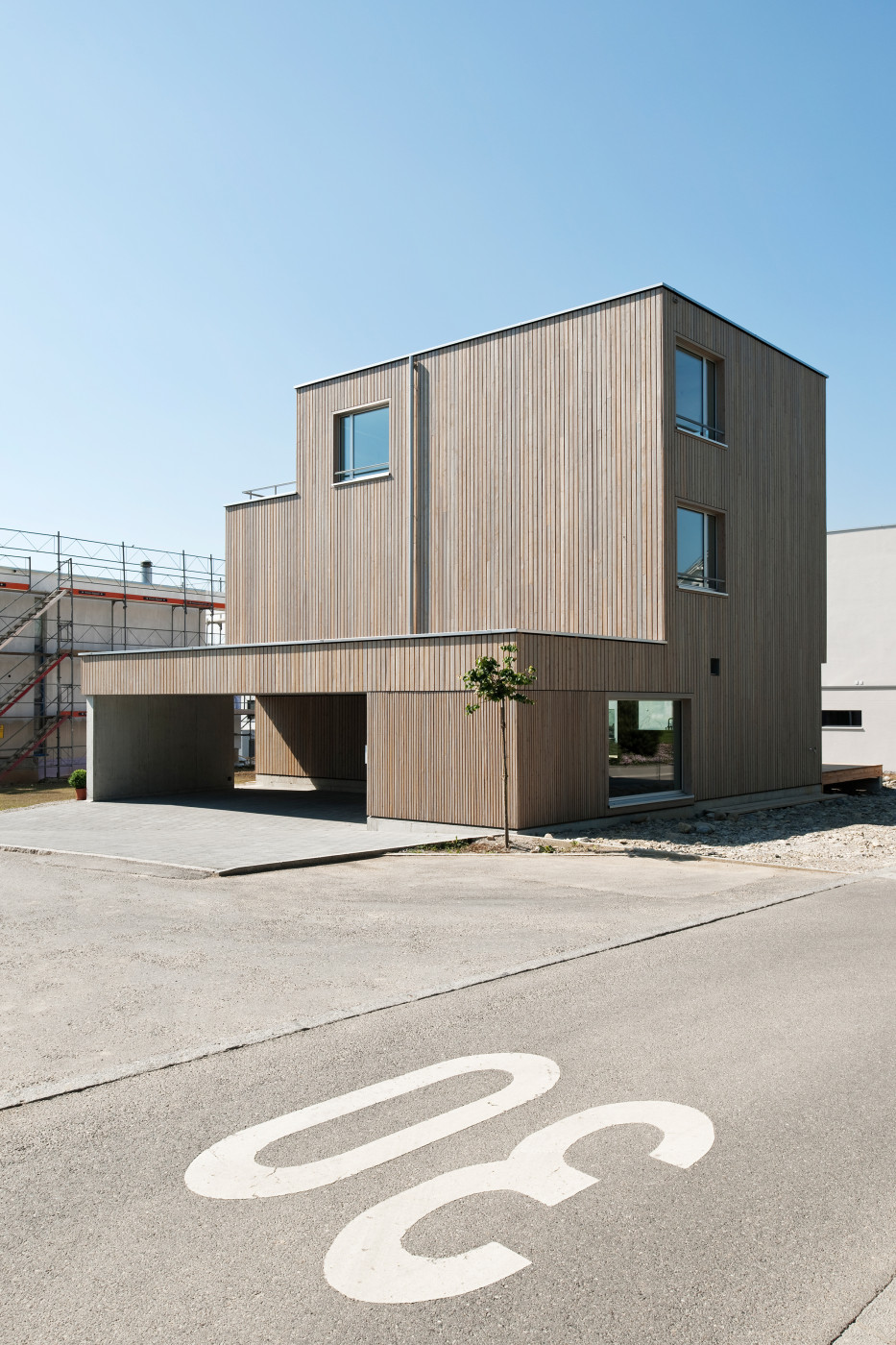 Die Wärmeerzeugung erfolgt mit einer Luft-Wasser-Wärmepumpe und die Gebäudehülle erfüllt den Minergie-Standard. Mit seinen grossformatigen Holz-Metallfenstern mit hölzernen Einfassungen und einem Kleid aus vorvergrauter Lärche hebt sich der Neubau deutlich von den ihn umgebenden weissen Kuben ab.