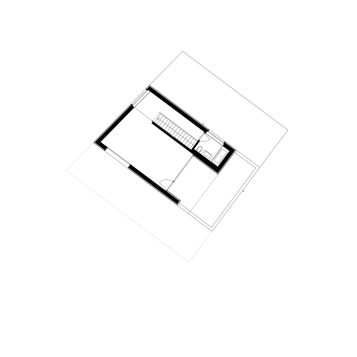 Im Obergeschoss sind drei beinahe quadratische Zimmer entlang der linearen Erschliessung aufgereiht. An deren Ende befinden sich das Bad und ein Arbeitsbereich. Im Dachgeschoss lässt sich das Elternschlafzimmer, oder ein zweites Wohnzimmer, mit einer Schiebetüre vom restlichen Geschehen abtrennen. Nach dem Aufstieg winkt die Aussicht als Belohnung.