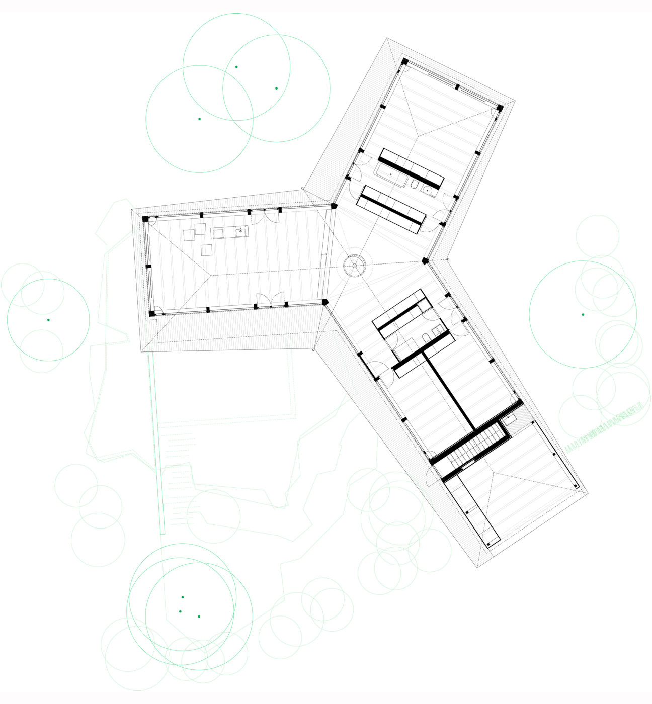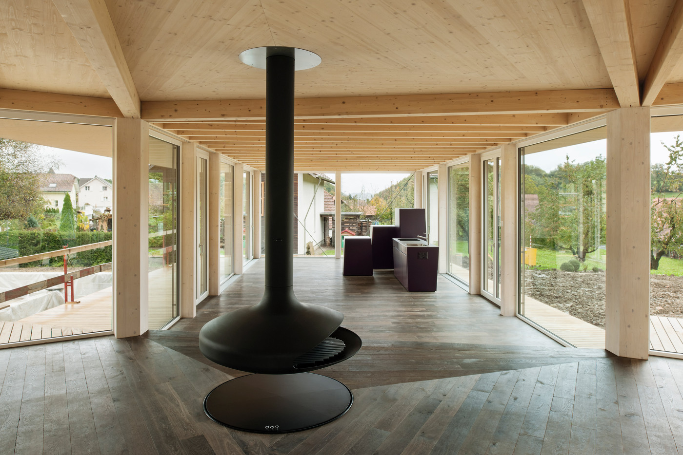 Der sternförmige, rundum verglaste Bau liegt am Rand der Wohnzone im ländlichen Kulmerau. Er breitet seine Arme aus und lässt Innen- und Aussenraum zu einem Kontinuum verschmelzen. Im Schnittpunkt der Gebäudeflügel liegt der offene Kamin, er bildet das Zentrum des Hauses.