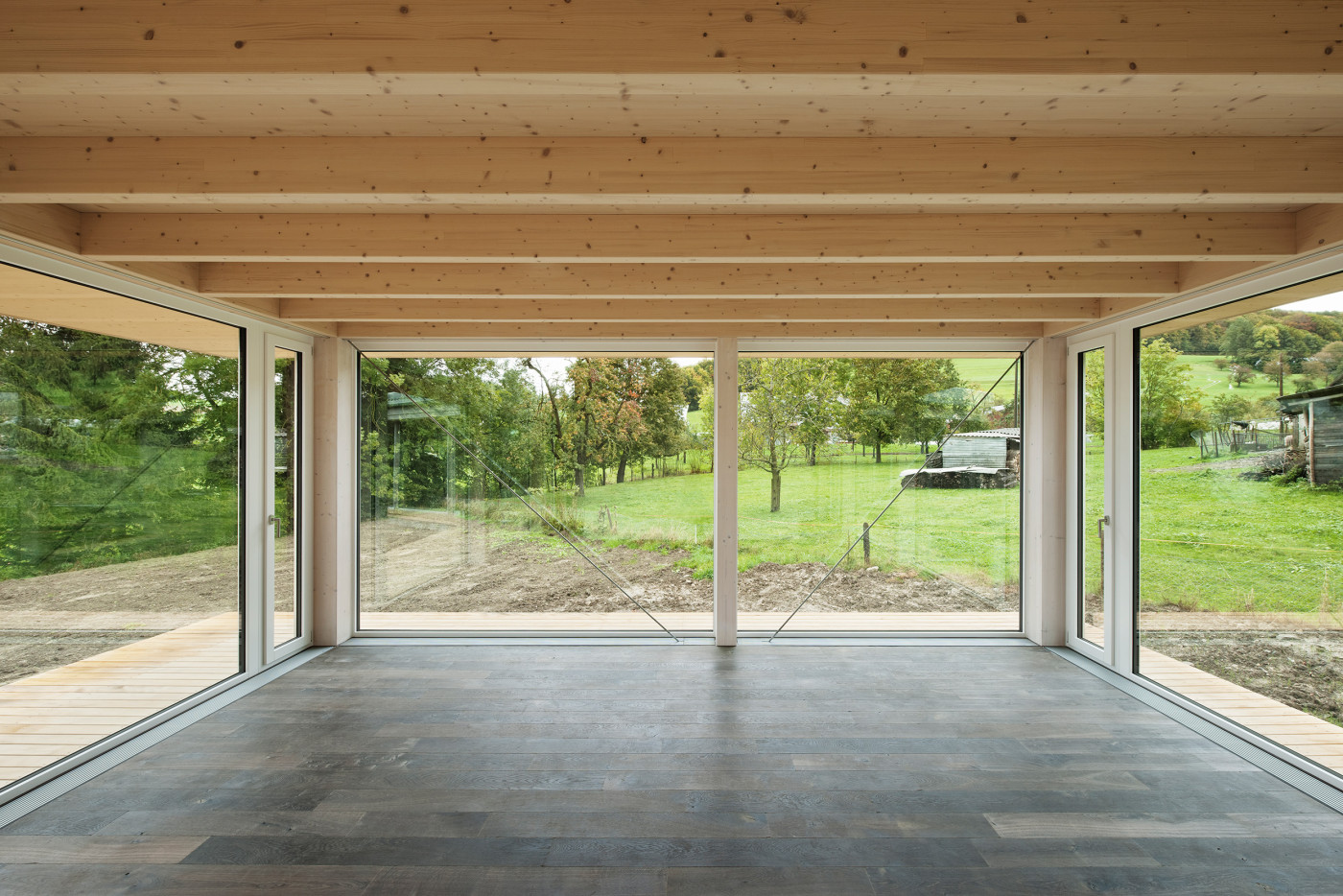 Der eingeschossige Holzbau steht auf einer Plattform aus Beton. Die Lasten werden über die Fassadenstützen abgetragen. Die Aussteifung wird mittels filigranen Zugstangen aus Stahl erreicht. Das Dach in Welleternit ist den landwirtschaftlichen Bauten der Umgebung nachempfunden.