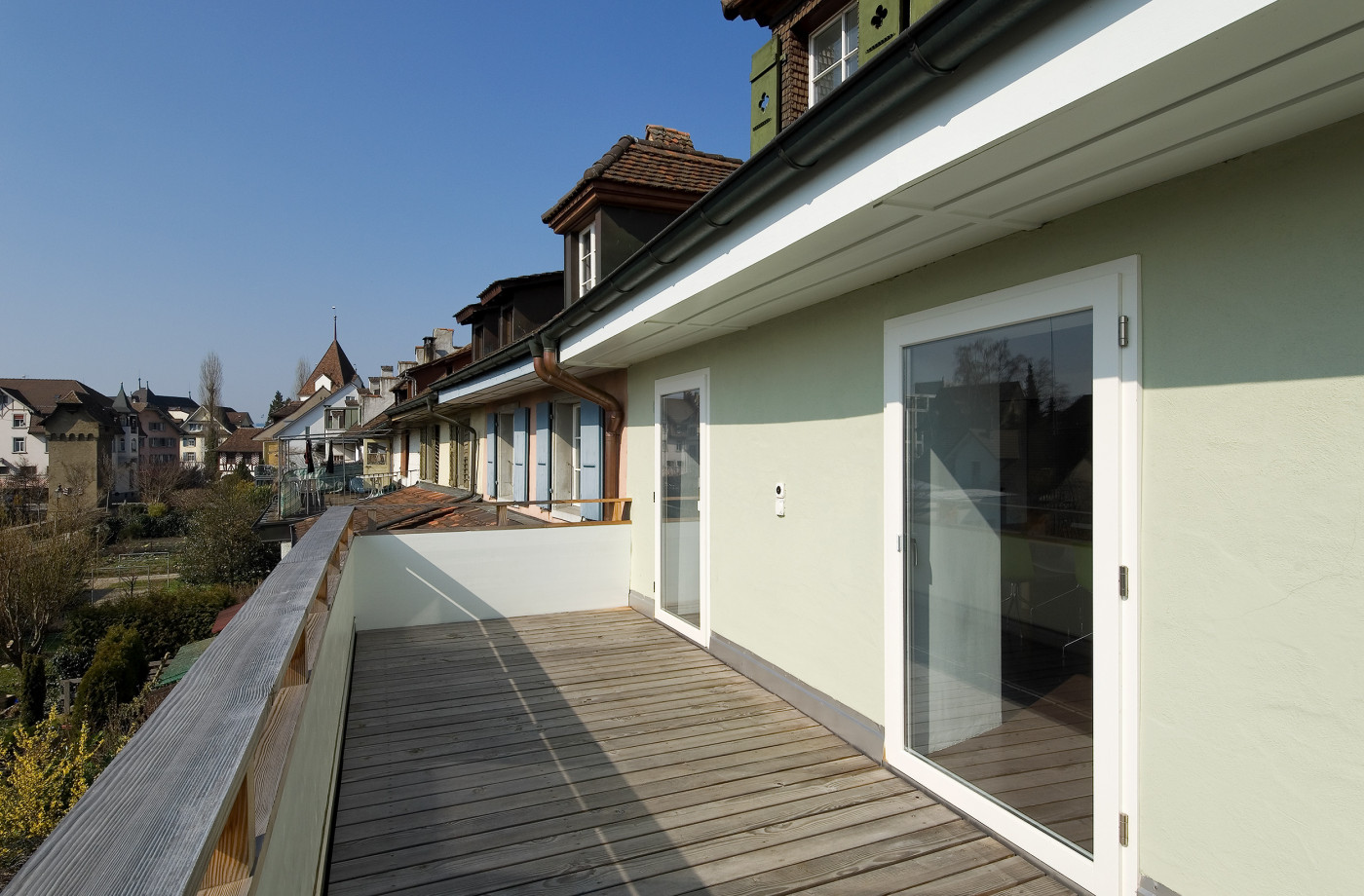 Die ursprünglich kleinteilige Zellstruktur des zweiten Obergeschosses wird zugunsten einer offenen, zur Terrasse hin orienterten Wohnküche aufgehoben. Die an die Brandmauern gerückten Treppen und Einbauten schaffen einen grosszügigen Raumeindruck auf bescheidener Grundfläche. Das Dachgeschoss, vormals Wohnraum, wird neu als Eltern-Schlafzimmer mit offenem Bad genutzt.